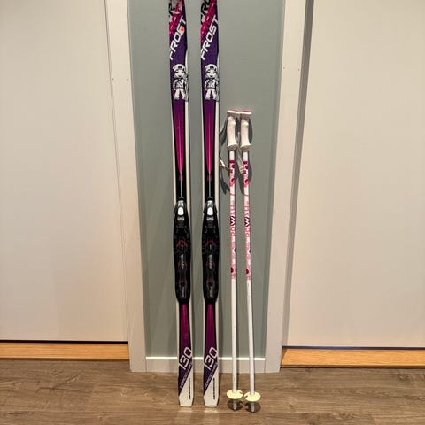 Madshus langrennsski 130cm med tilhørende staver 95cm og bindinger. Skiene har en kombinasjon av rød, blå og svart farge. Passer til langrenn og skiaktiviteter.