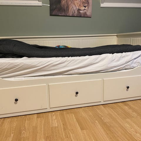 IKEA seng med tre oppbevaringsskuffer under sengerammen. Sengen har en ramme i tre og inkluderer en madrasser. Passer til rom med begrenset plass og kan brukes som enkeltseng eller dobbelt seng.