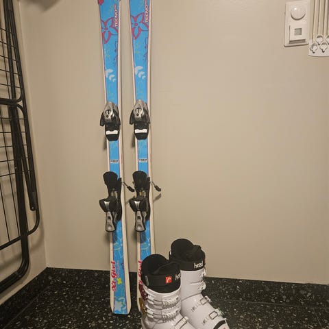 Rossignol ski med bindinger. Skiene har et design med farger som svart og oransje.