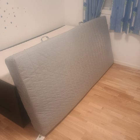 IKEA Sultan Herand madrass med grått trekk. Madrassen har en enkel design og er beregnet for enkeltseng. Trekket har vaskesymboler for vedlikehold.