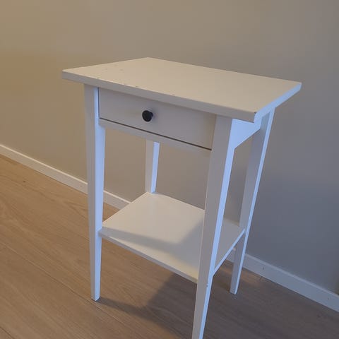 Eldre modell, ikea hemnes nattbord. Noen bruksmerker på sidene av bordet, ingen på toppen. Bruksmerke på veggen inni, dette kan sikkert vaskes. Brukt på barnerom, oppbevart leker og bøker inni.
