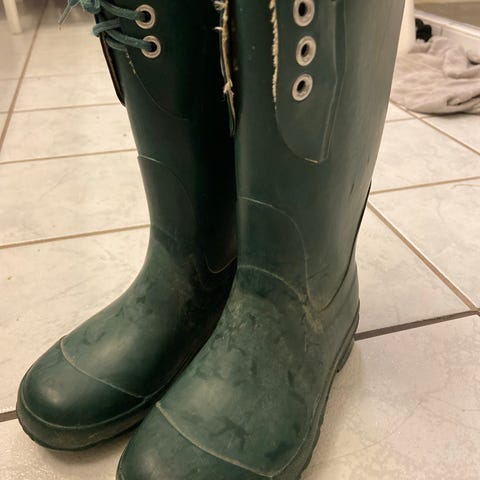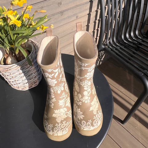 Bisgaard barnestøvler i størrelse 36 for barn, unisex. Støvlene har en kombinasjon av olivengrønn og beige med et mønster på skaftet. Egnet for bruk i våte og gjørmete forhold.Ps!mangler et tau på den ene men det gjør ikke noe.