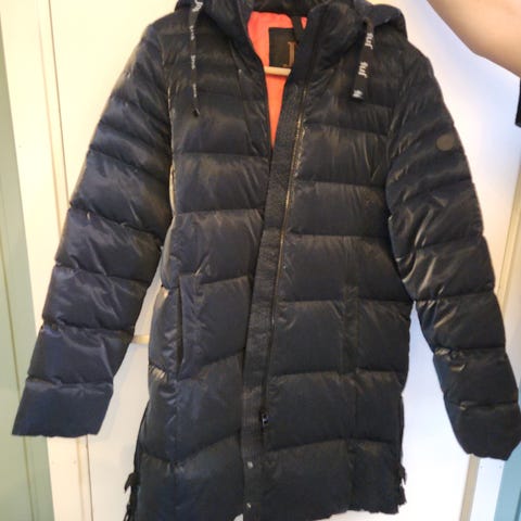 Pent brukt dunjakke med avtakbar hette. Vind- og vanntett. Meget god jakke, men nå er den liten for meg. Lengden på ryggen 90cm