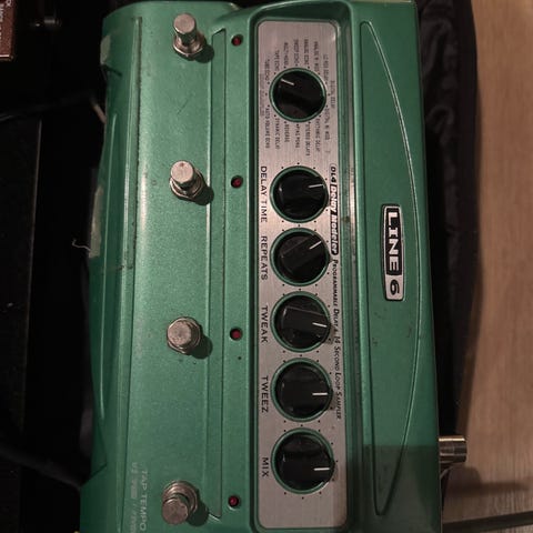TC Electronic Flashback X4 gitarutstyr med flere kontrollknapper for justering av lydparametere. Enheten har innganger for output, ekspresspedal, MIDI og strømtilkobling. Designet for bruk med gitar, med robust konstruksjon.