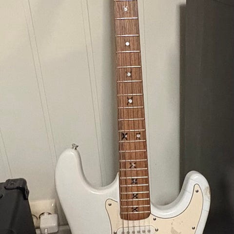 Selger elektrisk gitar med mixer, reim, jack kabel og stativ.