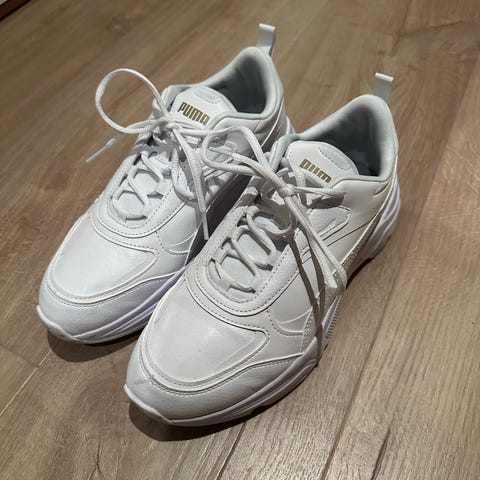 Puma Sneakers joggesko i størrelse 42, hvit farge. Skoene har SoftFoam+ innersåle for komfort. Egnet for daglig bruk. Brukt kun en gang, da de ble for store for meg.