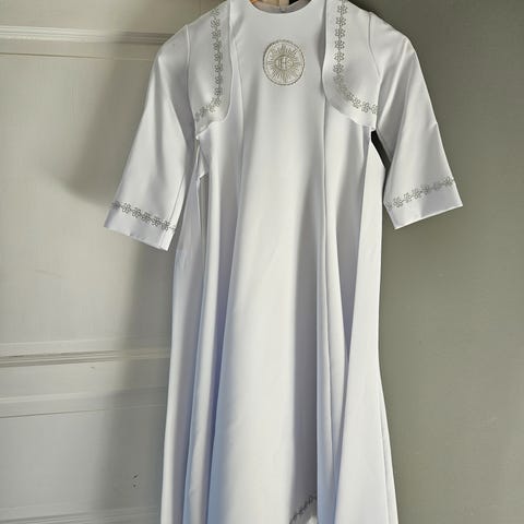 Nydelig kjole med detaljer i veldig god stand. Den ble laget for en høyde på 138 cm og passer en slank figur. Alle tilbehør på bilder er med. Sko er i str 35 - 21.5cm.