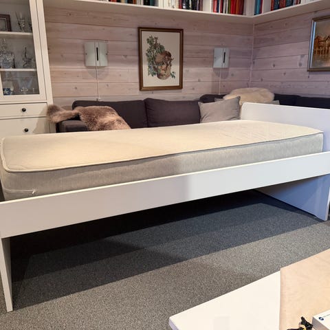 IKEA seng i hvit farge. Sengen har en enkel og funksjonell design, egnet for soverom.