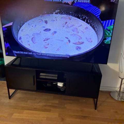 Tv-benk / oppbevaringsmøbel, med hyller og skap. Hyllene kan justeres.