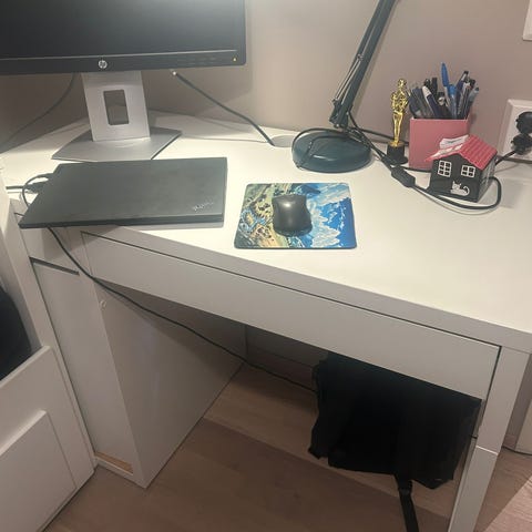 IKEA skrivebord med ramme i svart metall og bordplate i glass. Designet med en åpen hylle under bordplaten for ekstra oppbevaringsplass. Passer til bruk som arbeids- eller studieplass.