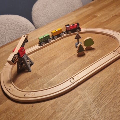 Togbane i tre , 2 batteridrevet lokomotiver ( kontrolleres av en spak på oversiden. De kan rygge og har lys som kan lyse opp veien fremover.)
