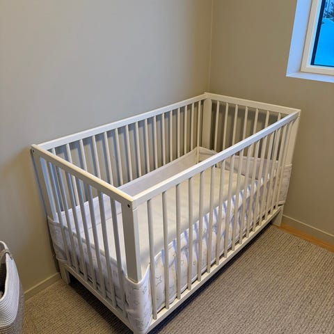 IKEA Myllra Sprinkelseng med hvit finish og trestenger. Designet for barn, med en praktisk skuff under for oppbevaring. Laget i tremateriale. Et bittelite hakk i kortsiden, ellers fremstår den som ny