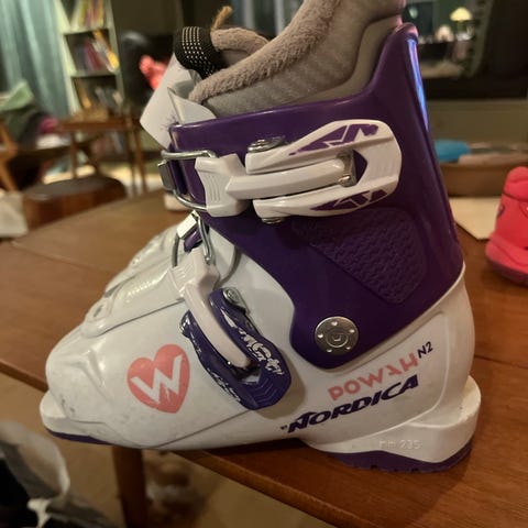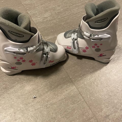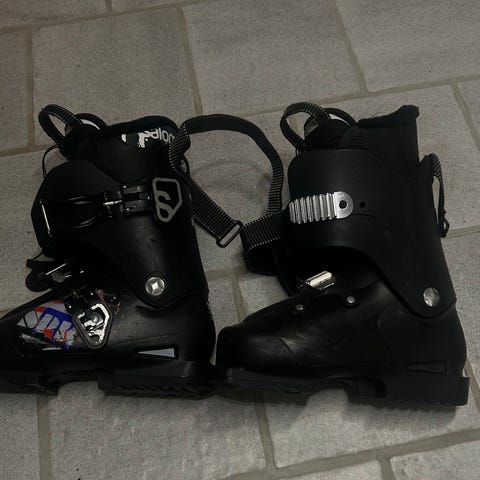 Salomon RCS 215 alpinski støvler i størrelse 215. Støvlene har en rød farge med grå spenner og polstret innside. Designet for alpinski med justerbare spenner for god passform.