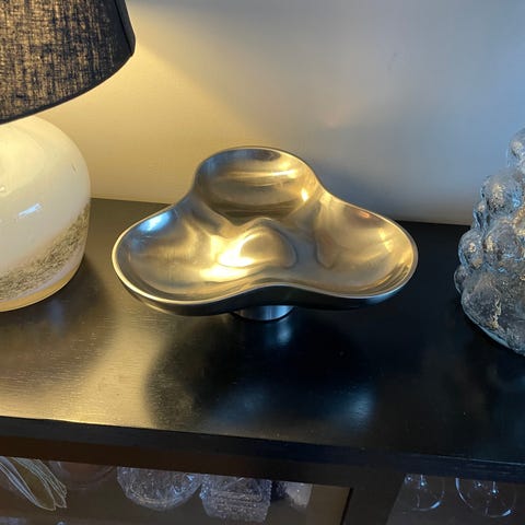 Georg Jensen Bloom skål med en diameter på 26 cm i blankt utførelse. Skålen er laget i metall og har et design inspirert av japanske kirsebærblomster. Passer til bruk som serveringsskål eller dekorasjon.