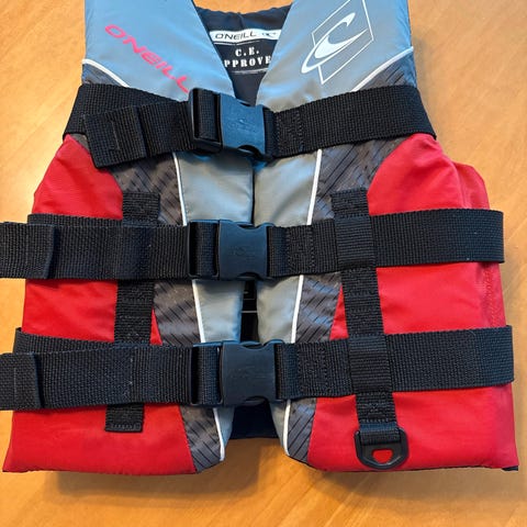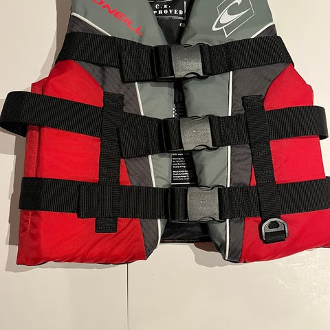 O'Neill Redningsvest i fargene rød og grå. Utstyrt med tre justerbare spenner for sikker passform. Designet for vannaktiviteter og sikkerhet.