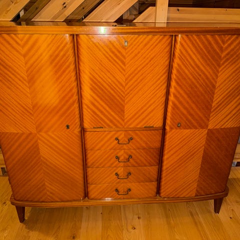 Skapet er robust og i god stand, med normal bruksslitasje på topplaten. Møbelet er tungt og må bæres av to personer ved henting.