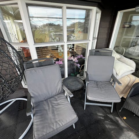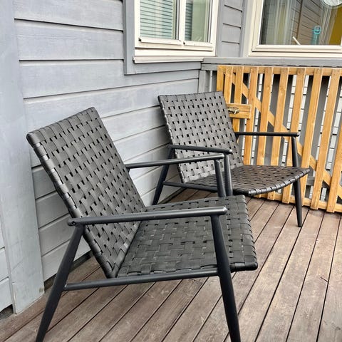 Sett med to lenestoler og ett bord. Lenestolene har ramme i metall og sete i flettpolymer i brunfarge. Bordet har glassplate og metallramme i svart. Møblene er egnet for utendørs bruk, for eksempel på balkong eller terrasse. Puter medfølges