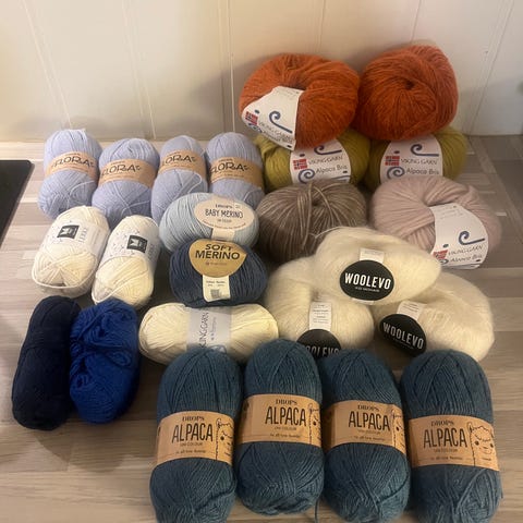 Månetoppen Tvilling garn i blå farge. Garnet består av flere nøster og er egnet for strikking og andre tekstilprosjekter.