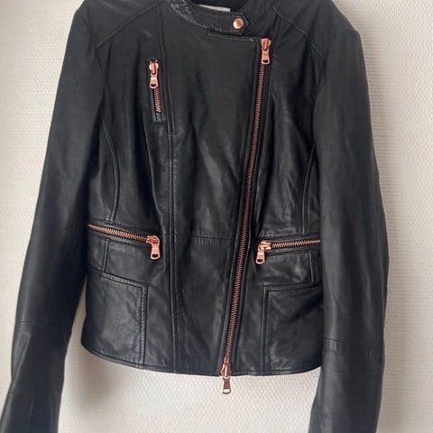 Skinnjakke, farge lilla, størrelse L/XL (ca str 42) for dame. Jakken har glidelås og sidelommer, med et enkelt og klassisk design.