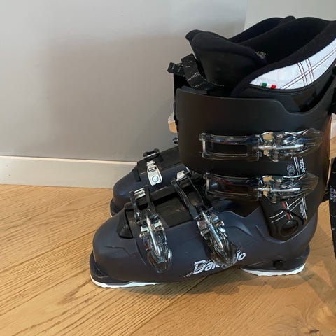 Lite brukt Dalbello Sport alpinstøvler i blå og gul farge, størrelse 39,5. Støvlene har to spenner for justering og en myk, pelsforet innersko for komfort. Egnet for alpinski. Selges separat eller med tilhørende slalåmski av god kvalitet.,tyskprodusert. Samlet kroner 1600, separat 500 sko, 1300 for ski. Lite brukt, men noen riper i skiene