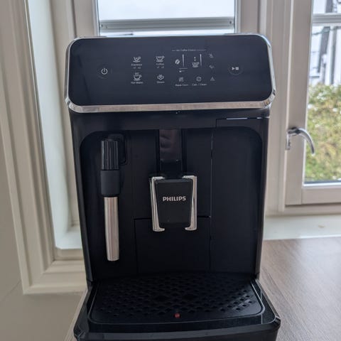 Philips kaffemaskin i hvit farge med digitalt kontrollpanel. Maskinen har en avtakbar vanntank og dryppbrett, og er utstyrt med en melkeskummer for ulike kaffedrikker. Egnet for bruk i hjemmet eller kontoret.