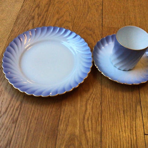 Porsgrund Maud servise sett som inkluderer kaffekanne, kopper, fløtemugge, sukkerskål og tallerkener. Serviset har en klassisk design med hvit og blå farge, laget av keramisk materiale. Passer til servering av kaffe og måltider.