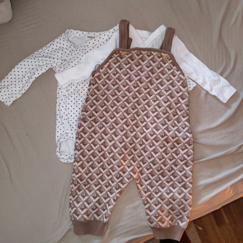 Pysjamas, snekkerbukse og ett hvitt sett med to bukser. En bukse i 60cm og en i 70 cm