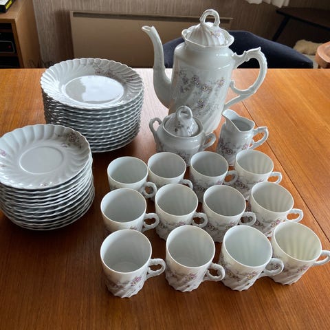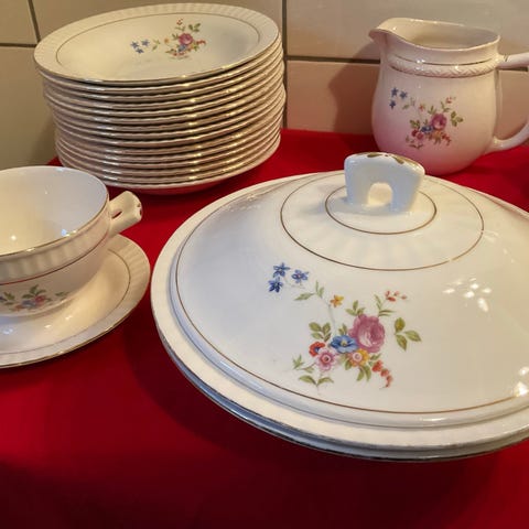 12 flate, 12 dype og 12 dessert-tallerkner. Et runde fat, en terrin, sausenebb. Tre ovale fat og to potetfat. Meget pent.