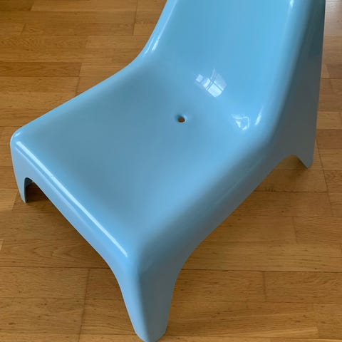 IKEA barnestol i blå farge. Stolen har en plastsetedel med hull og et hvitt understell med hjul. Egnet for barn.