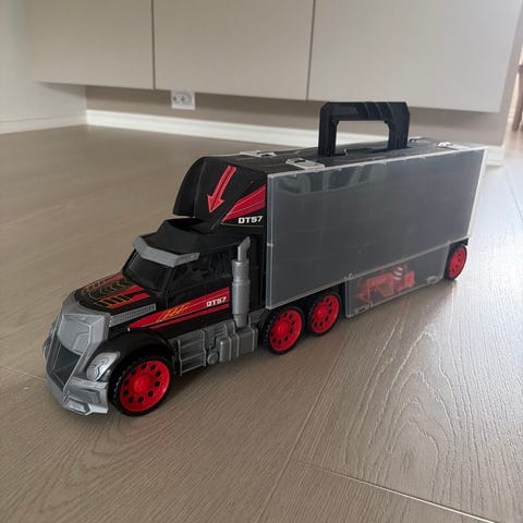 En eske med små og store biler + 2 bilbaner.