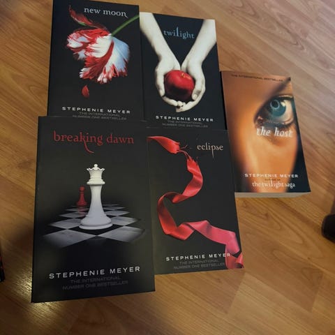 Pocketbøket lest en gang og fremstår pent brukt. Twilight har en et lite eseløre på fremsiden. Bøkene selges samlet for 180 kr