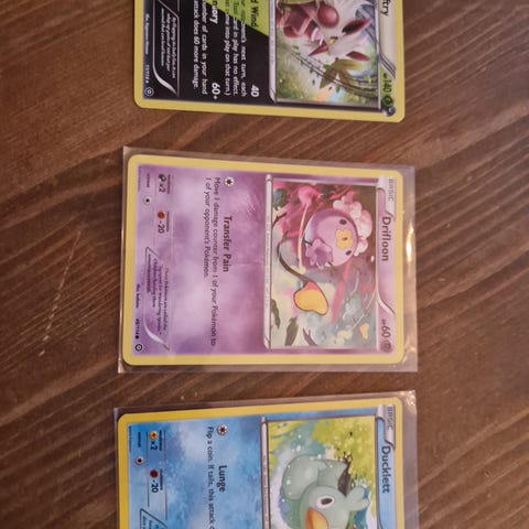 Pokémon samlekort med ulike motiver og karakterer. Kortene varierer i farger og illustrasjoner, og kan brukes til samling eller spill.