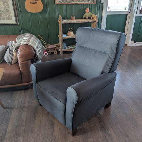 Pen grå lenestol med puff. I puffen er det god plass til oppbevaring. Stolen har stått mest til pynt og har ingen merker eller skader. Kjøpt hos Langleite møbler på Årnes, kostet ca 10 000kr