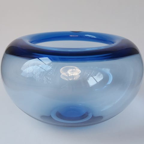 Glassvase i blågrønn farge med en høyde på 18 cm. Vasen har et unikt design med en bredde på 9 cm på det bredeste punktet. Egnet for dekorative formål.