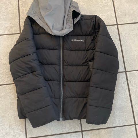 Didriksons Galon barnejakke i størrelse 140, unisex. Jakken er blå med svarte ermer og har hette. Den er laget av 100% vanntett materiale og har fleecefôr på innsiden for ekstra komfort.