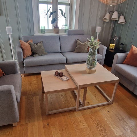 Tykkelsen på sitteputene er 15 cm, og på ryggputene 20,5 cm.