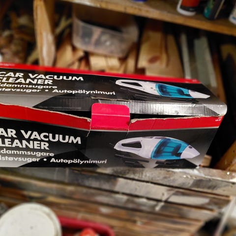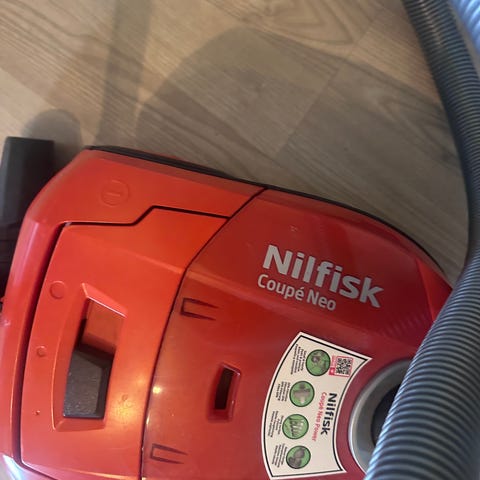 Coline støvsuger i rød og svart farge. Designet for rengjøring av gulvflater og tepper. Utstyrt med slange og munnstykke for effektiv støvsuging.