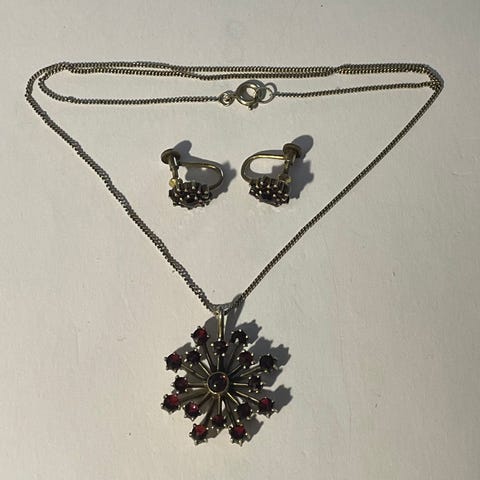 Nydelig anheng i 800S forgylt med Granater, H 2 cm B 1,5 cm Vekt 2,7 gr Selges for kr 1300,-