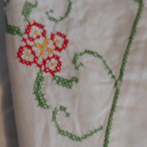 Sjeldent vakker, vintage duk med håndbroderte motiver. Tykk bomull