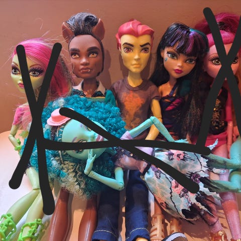 Monster High dukke med flerfarget hår, iført rosa genser, flerfargede shorts og blå strømper.