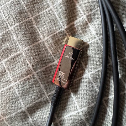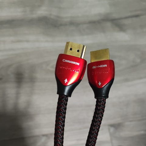 Audioquest Golden Gate lydkabel med 3,5 mm jack til 3,5 mm jack-kontakter. Kabelen har en flettet design og røde kontakter, egnet for tilkobling av lydutstyr med 3,5 mm inngang og utgang.