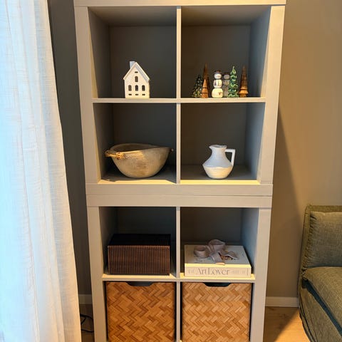 2 Hyller til barnerommet selges. Disse tar liten plass, er lette og enkle å sette sammen uten skrutrekker. Kan bygges til ønsket høyde. Litt ubetydelige bruksmerker.