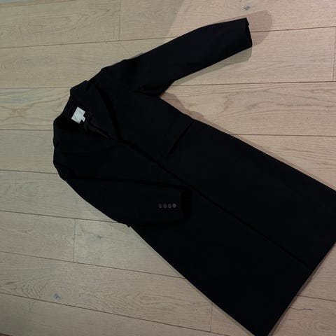 H&M kåpe i størrelse 40 for dame, farge svart. Selges kun for blitt litt for liten. Jakken har knappelukking og er laget i et tekstilmateriale med strukturert overflate.