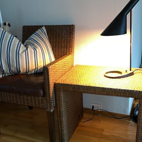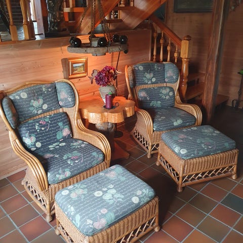 Liten skade i ryggputene, se vedlagte bilde. Ingen skader på skinnputene. Skade i rottingen på ene benet, se bilde. Passer perfekt til stue, hytte, vinterhage eller hagestue.