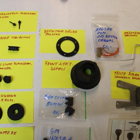 Cadillac bilreservedeler i ulike typer og størrelser. Inneholder diverse fester, klips, fjærer, pakninger og andre smådeler som kan brukes til vedlikehold og reparasjon av Cadillac-biler.