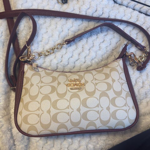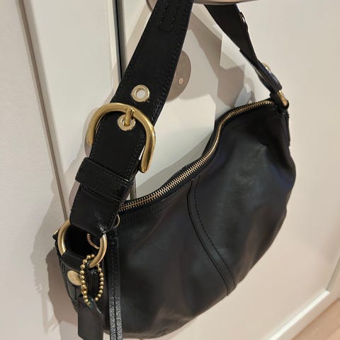 Coach veske i materiale av strå, designet for dame. Vesken har et justerbart skulderbånd og en lukking med klaff. Mønsteret på vesken er blomsterinspirert med mørke kanter.