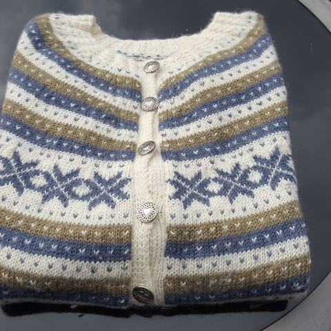 Nydelig fanakofte, strikket i hvitt og brunt ullgarn. Fine knapper. Kofta har nesten ikke vært brukt, så fremstår som ny. Ingen merker eller flekker. Overvidde 100 cm, 60 cm lang.