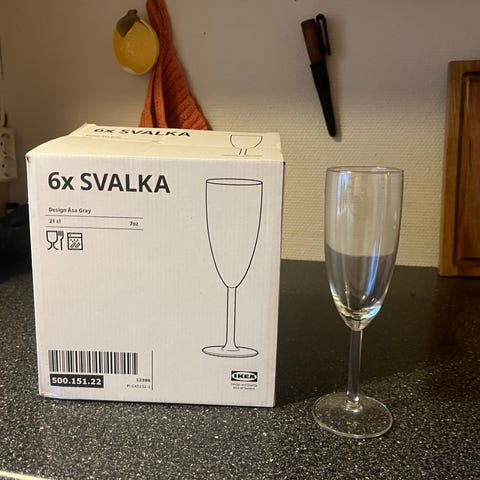 IKEA SVALKA champagneglass med kapasitet på 21 cl. Glassene er laget i klart glass og leveres i pakker med 6 stk. Egnet for servering av champagne eller musserende vin.