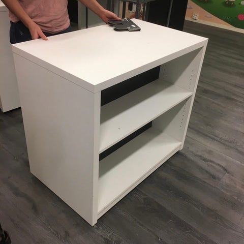 To reoler i lyst tre med flere hyller. Hver reol har åpent design med justerbare hyller for oppbevaring av bøker, dekor eller annet. Passer til bruk i hjem eller kontor for organisering og oppbevaring.