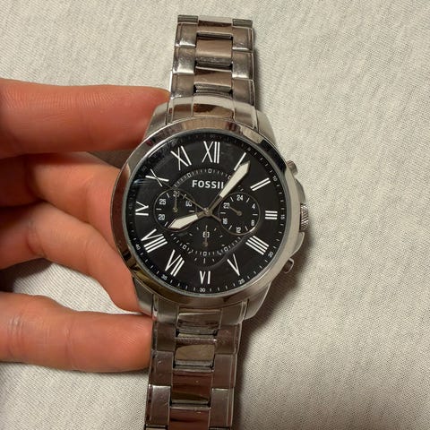Fossil herreklokke i rustfritt stål med mørk urskive. Klokken har kronograf-funksjon og lenke i metall. Passer for menn og har en robust design.